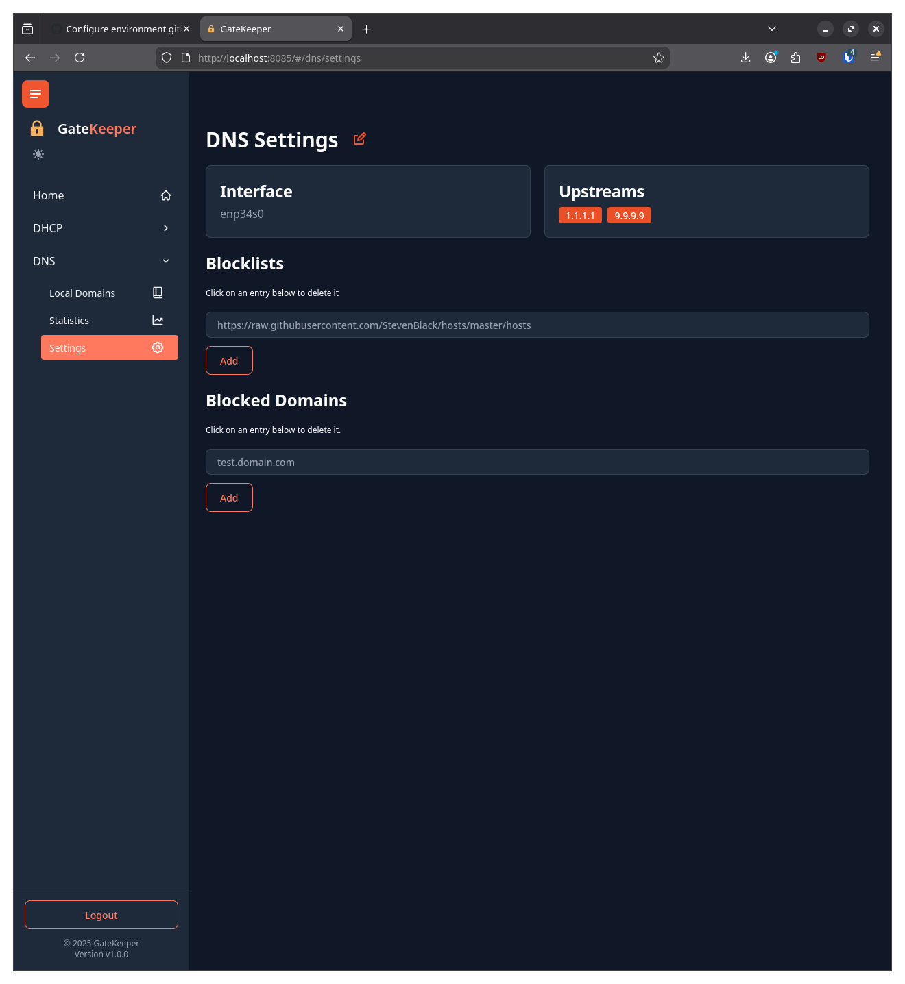 The DNS page shows local domains, statistics and settings for the DNS server.