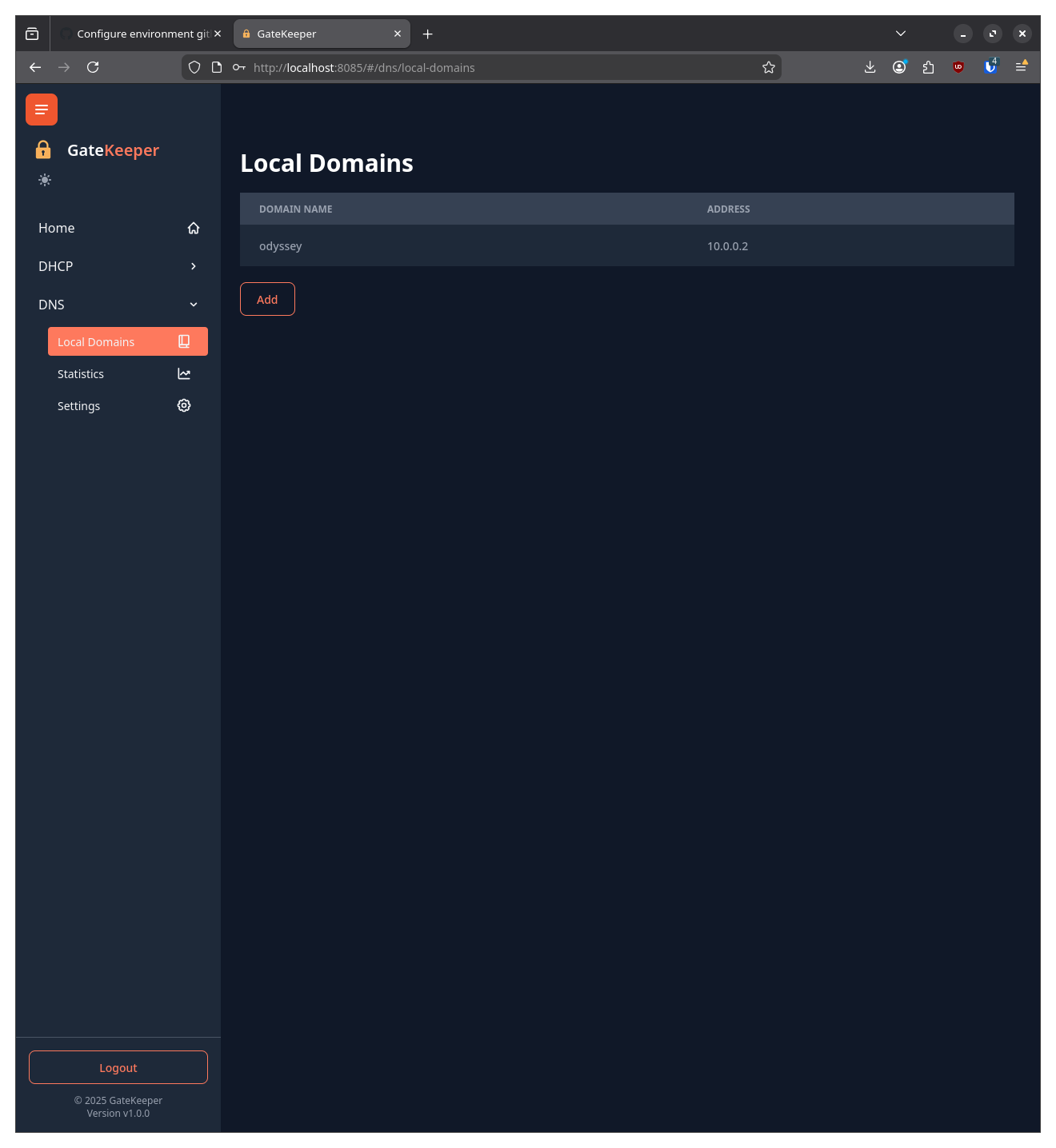Clicking the Add button will open a modal dialog to add a new local domain, and clicking on an entry in the list will open a modal dialog to edit it.